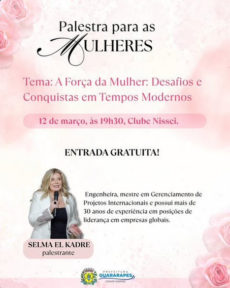 A iniciativa busca valorizar o papel da mulher na sociedade contemporânea, destacando suas conquistas, desafios e a importância da liderança feminina em diferentes contextos. A palestra será ministrada por Selma El Kadre, engenheira e mestre em Gerenciamento de Projetos Internacionais, com mais de 30 anos de experiência em posições de liderança em empresas globais.