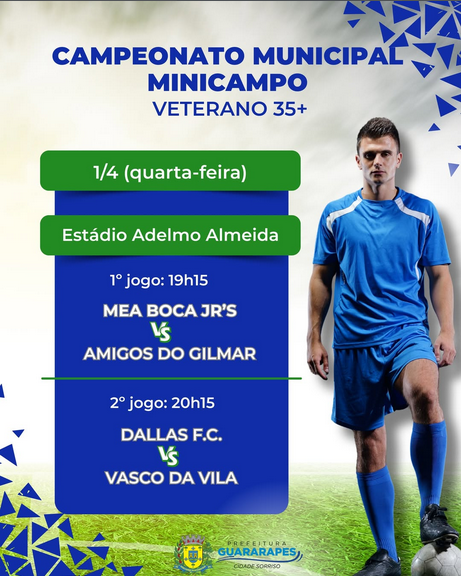 O Campeonato Municipal de Minicampo, categoria Veterano 35+, terá mais uma rodada nesta quarta-feira (1º) em Guararapes. As partidas serão realizadas no Estádio Adelmo Almeida, reunindo equipes tradicionais da competição.