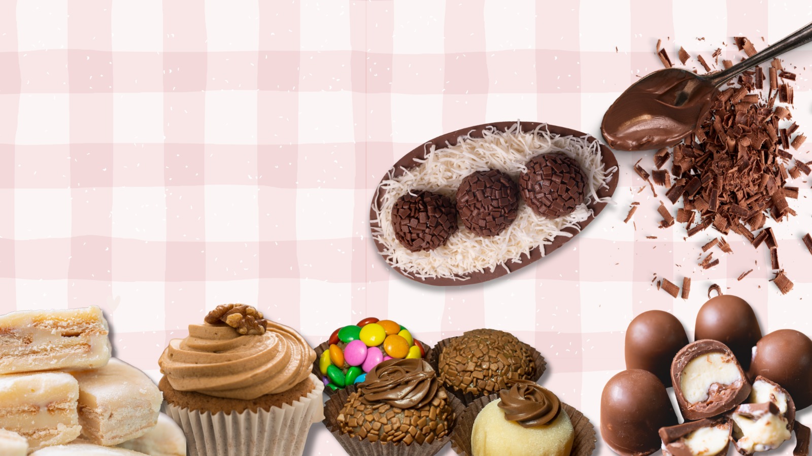 Trufas, Cones recheados, Cupcakes, Biscoito patinha de coelho, Brownie.